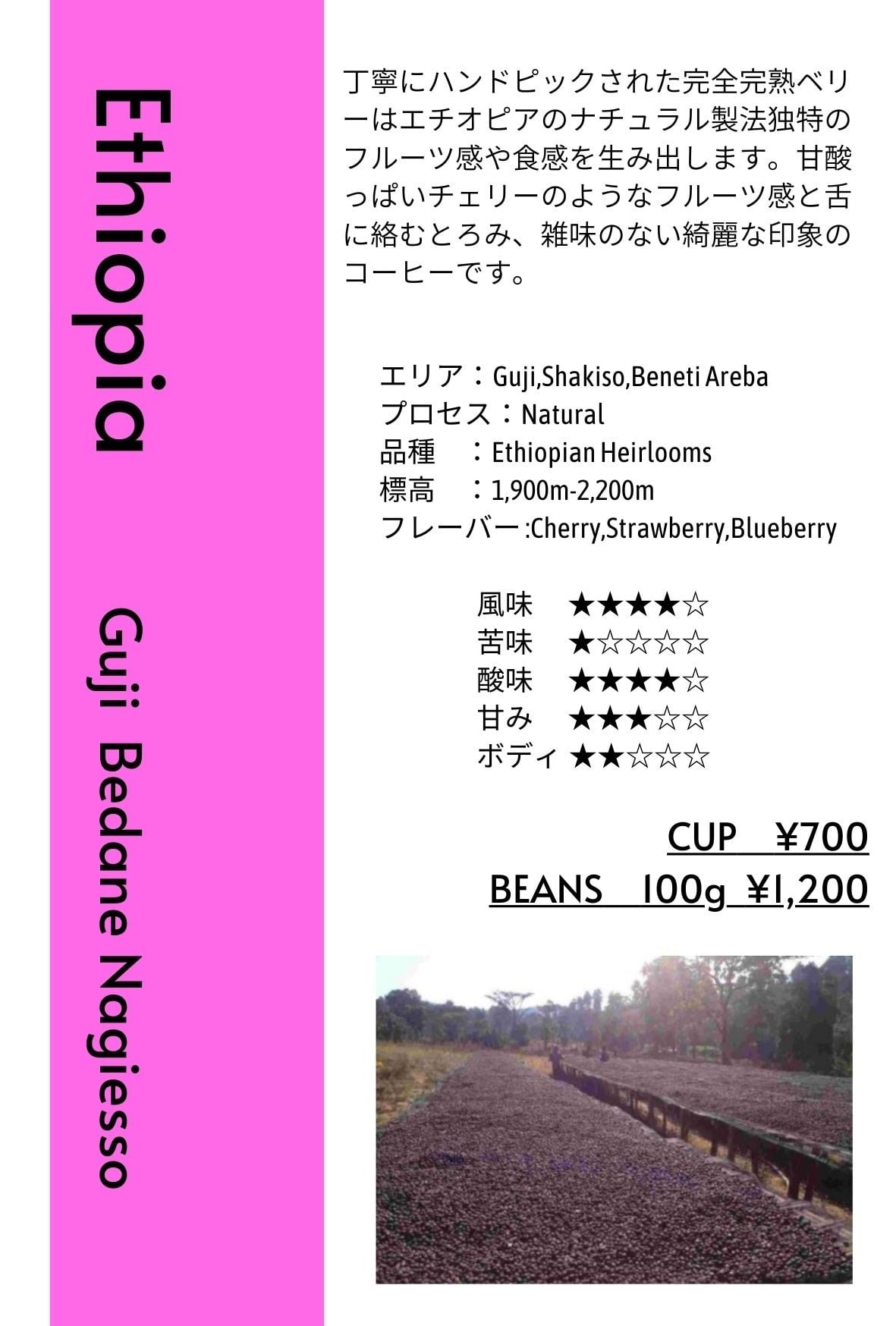丁寧にハンドピックされた完全完熟ベリーはエチオピアのナチュラル製法独特のフルーツ感や食感を生み出します。甘酸っぱいチェリーのようなフルーツ感と舌に絡むとろみ、雑味のない綺麗な印象のコーヒーです。