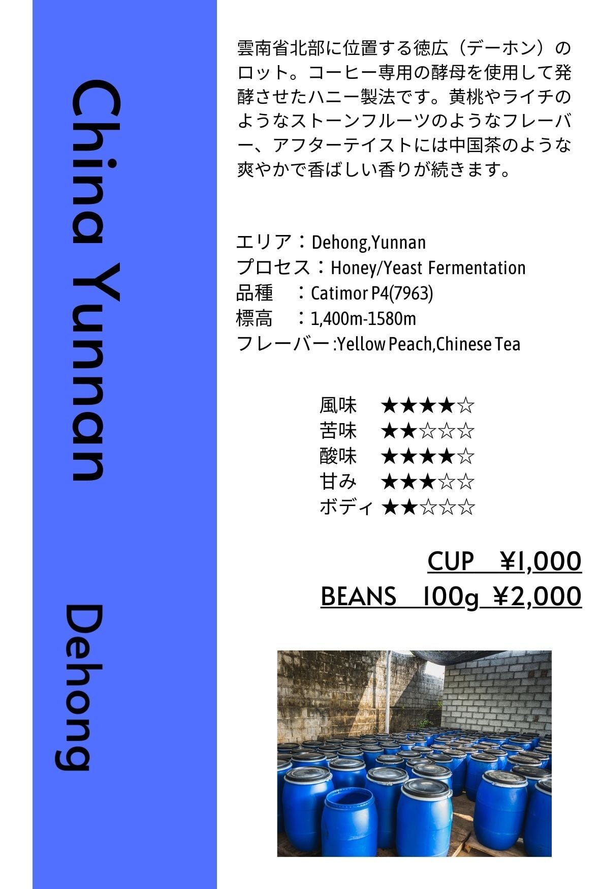 雲南省北部に位置する徳広(デーホン)のロット。コーヒー専用の酵母を使用して発酵させたハニー製法です。黄桃やライチを思わせるストーンフルーツのようなフレーバー、アフターテイストには中国茶のような爽やかで香ばしい香りが続きます。